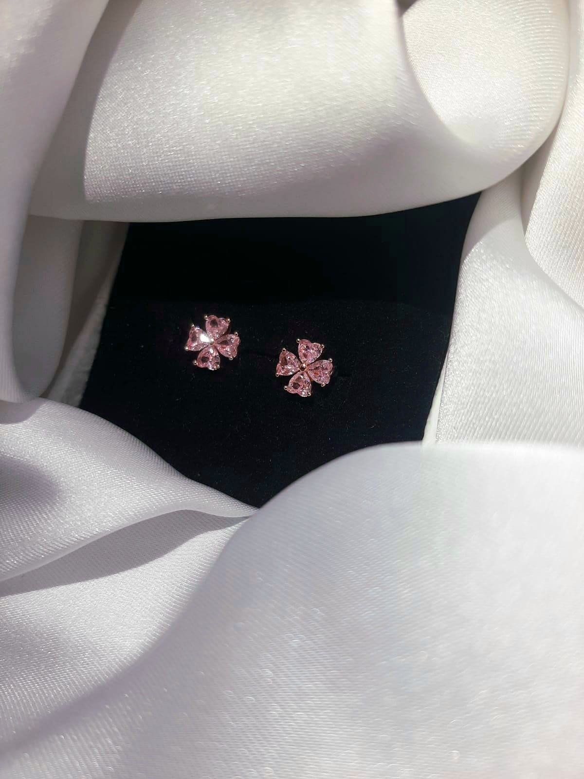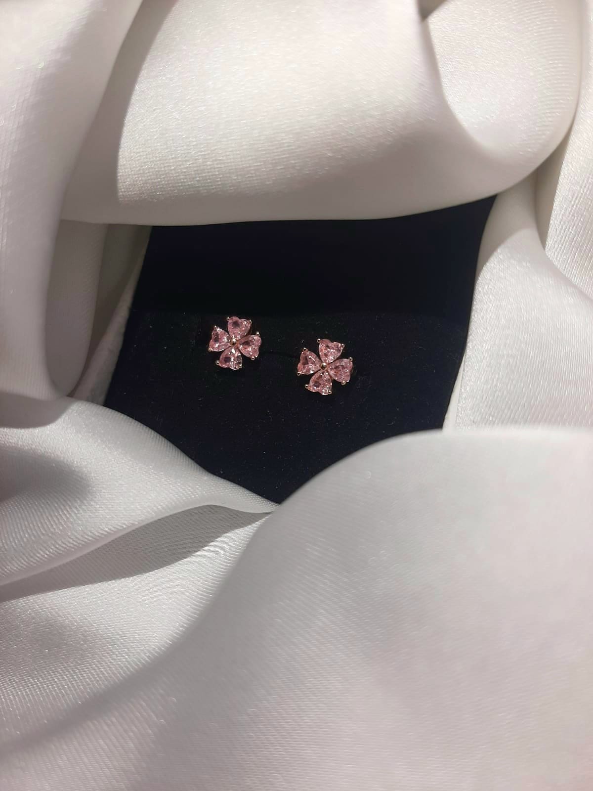 Orecchini in argento 925, color oro rosa, con cristalli rosa a forma di fiore.