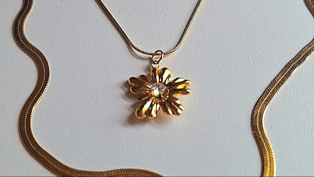 Collana a maglia stretta con pendente in accaio inossidabile a forma di fiore e zircone bianco, da abbinaìre alla collana girocollo in catena morbida a serprente.